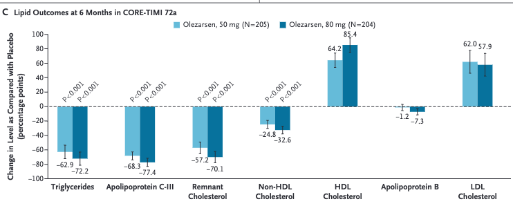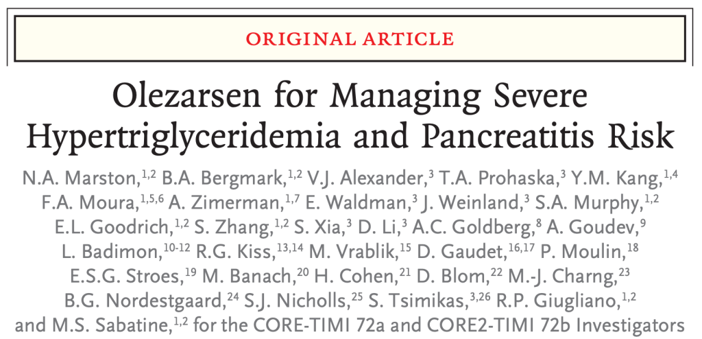 - Olezarsen is the first of a class of new drugs – Apo C3 inhibitors – that dramatically reduce triglyceride levels and pancreatitis risk. This class of medication works primarily by enhancing clearance of triglyceride rich lipoproteins. They are a welcome addition to the therapeutic armamentarium. Hopefully, pricing won’t limit access, but it probably will.